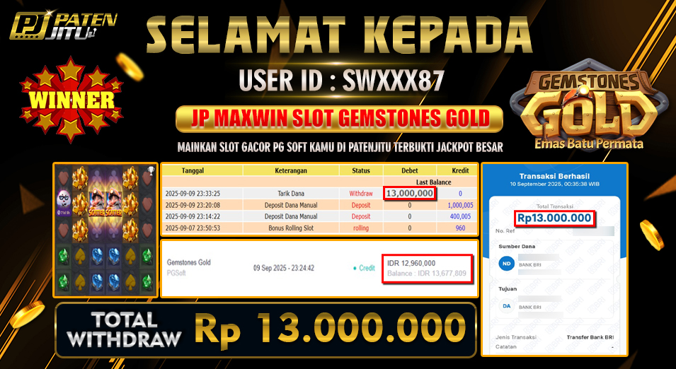 Hadiah telah di WD (Withdraw) oleh player yang bersangkutan Terima kasih untuk member setia kami telah mempercayakan PATENJITU sebagai BO pilihan anda. Post navigation MAINKAN SLOT MAHJONG BLACK SCATTER DI PATENJITU TERBUKTI SUPER GACOR MAINKAN GAME KESUKAAN MU HINGGA MENCAPAI MAXWIN YANG KAMU MAU