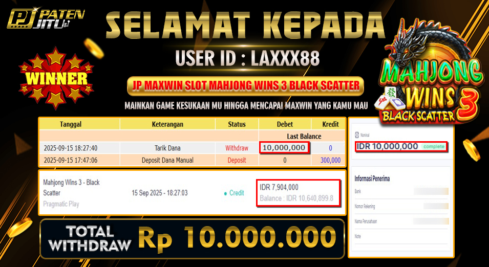 Hadiah telah di WD (Withdraw) oleh player yang bersangkutan Terima kasih untuk member setia kami telah mempercayakan PATENJITU sebagai BO pilihan anda. Post navigation MAINKAN SLOT GACOR PG SOFT KAMU DI PATENJITU TERBUKTI JACKPOT BESAR MAINKAN SLOT WILD BOUNTY SHOWDOWN DI PATENJITU DAN DAPATKAN KEMENANGAN BOMBASTIS NYA