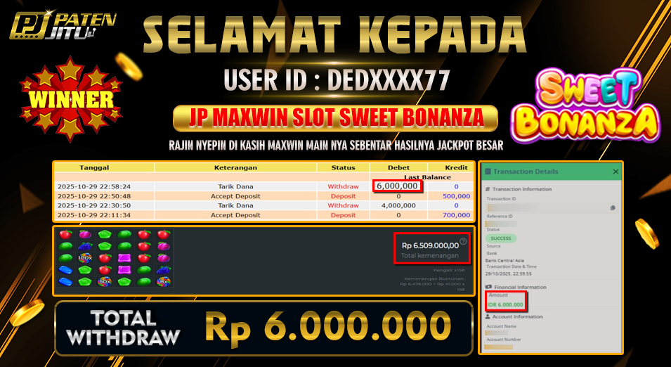 Hadiah telah di WD (Withdraw) oleh player yang bersangkutan Terima kasih untuk member setia kami telah mempercayakan PATENJITU sebagai BO pilihan anda.