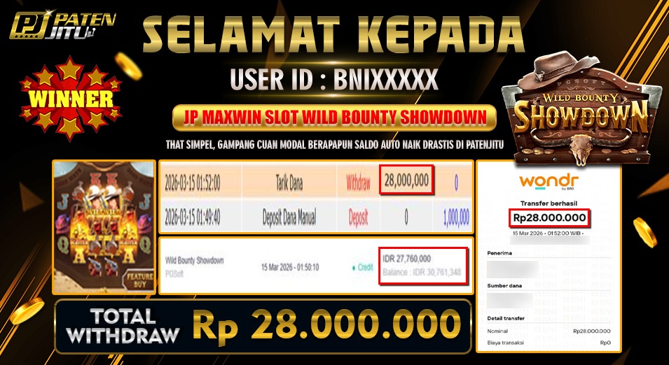 Hadiah telah di WD (Withdraw) oleh player yang bersangkutan Terima kasih untuk member setia kami telah mempercayakan PATENJITU sebagai BO pilihan anda.